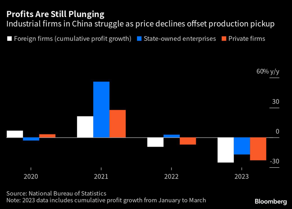 Profits at private firms fell 23% in the January-to-March period, while those at state-owned enterprises dropped 16.9%.