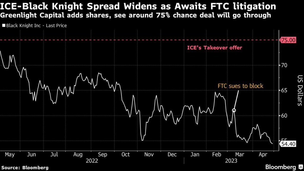 David Einhorn’s Greenlight Capital is betting against Wall Street in a wager that Intercontinental Exchange Inc.’s $11.7 billion acquisition of Black Knight Inc. is most likely to go through.
