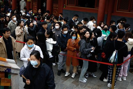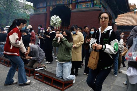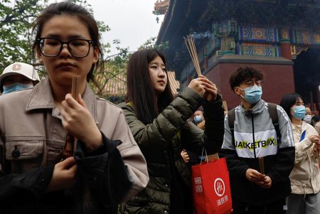 BEIJING (Reuters) – Queues stretch hundreds of metres around temples in China on weekends, as despondent young worshippers pray to find jobs in an economy slowly clawing its way back from the coronavirus pandemic.