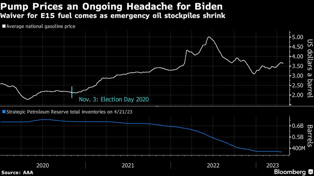 (Bloomberg) — The Biden administration on Friday issued an emergency waiver to enable widespread sales of higher-ethanol E15 gasoline this summer, following a strategy used to help pare high pump prices last year.