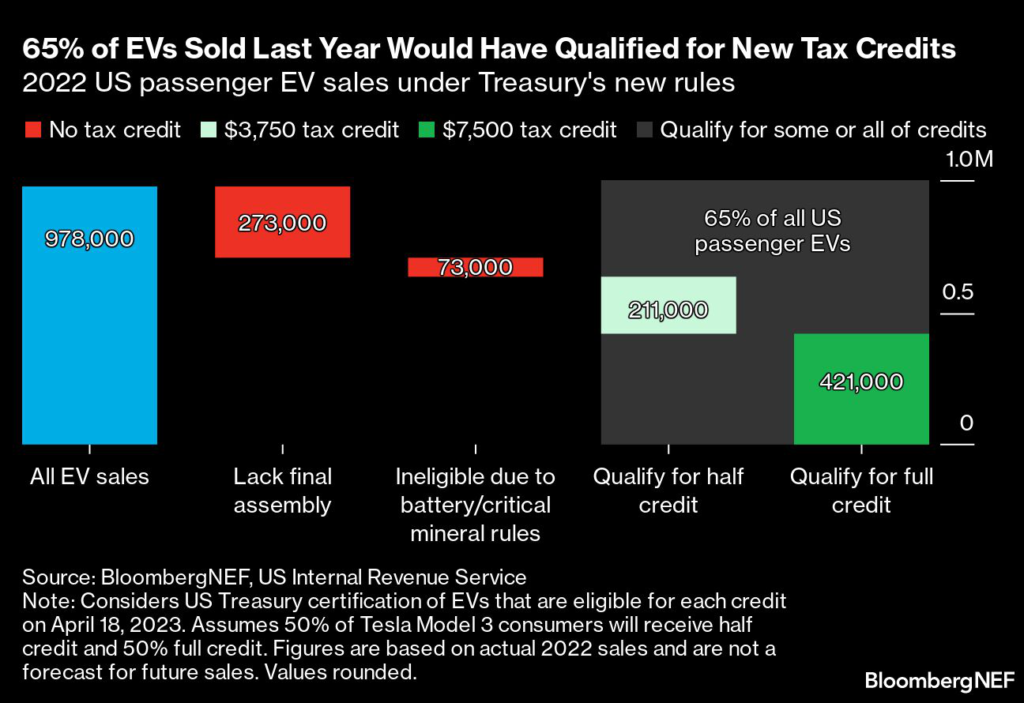 With the update released by the Treasury Department on April 17, buyers finally have clarity on which cars qualify for as much as $7,500 in benefits. (BloombergNEF)