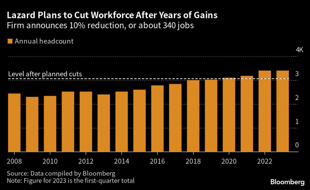 At Lazard, with roughly 3,400 employees as of the end of March, the announcement signals about 340 jobs will be lost.