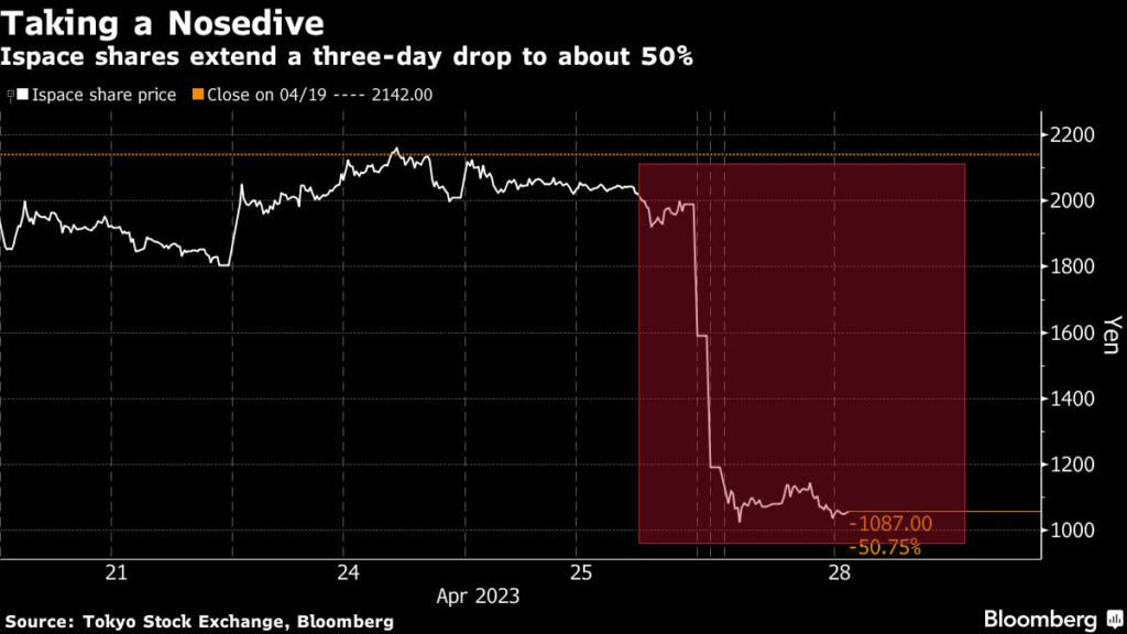 Tokyo-based Ispace Inc.’s shares slumped for the third straight day after the failure of its moon lander, erasing about $600 million, or almost half, of the company’s value.