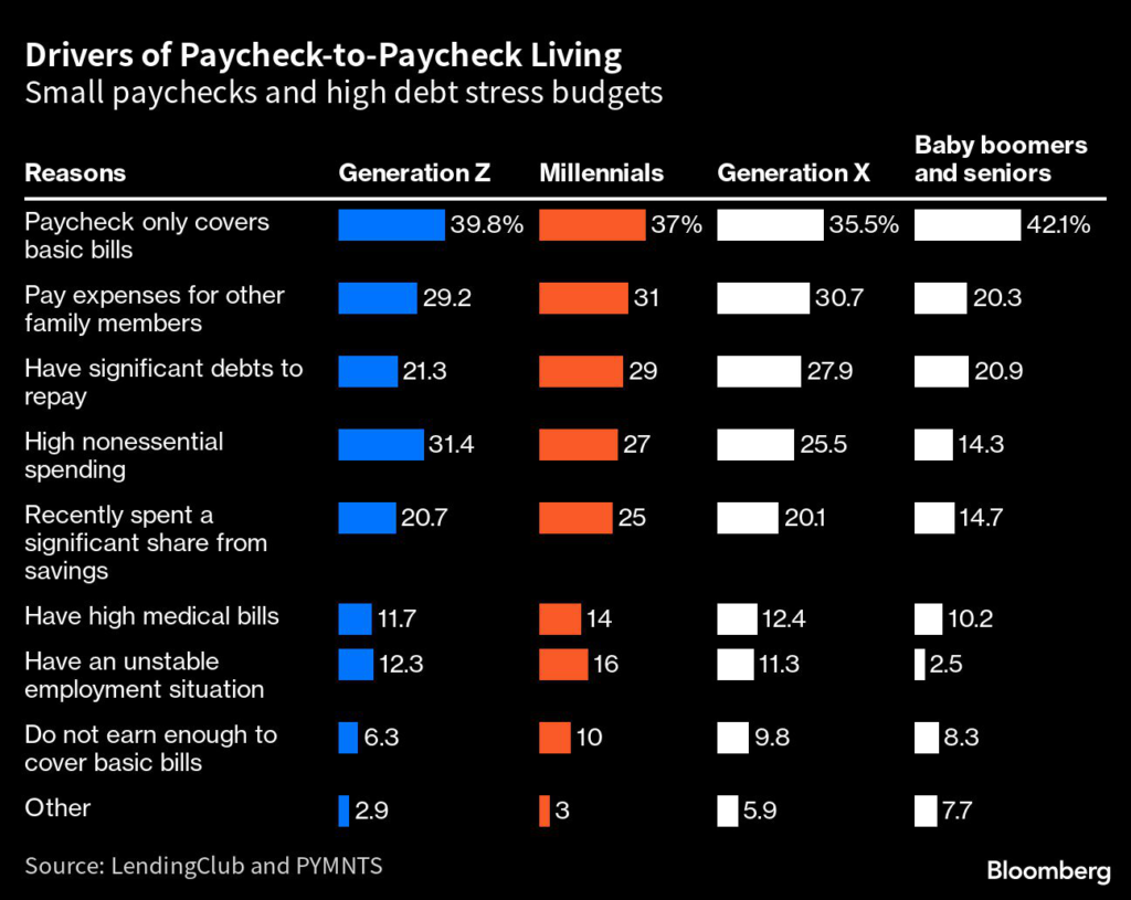 (Bloomberg) — The share of young people who struggle to cover everyday bills jumped from a year ago, while that of seniors living paycheck to paycheck leveled off, according to a report.