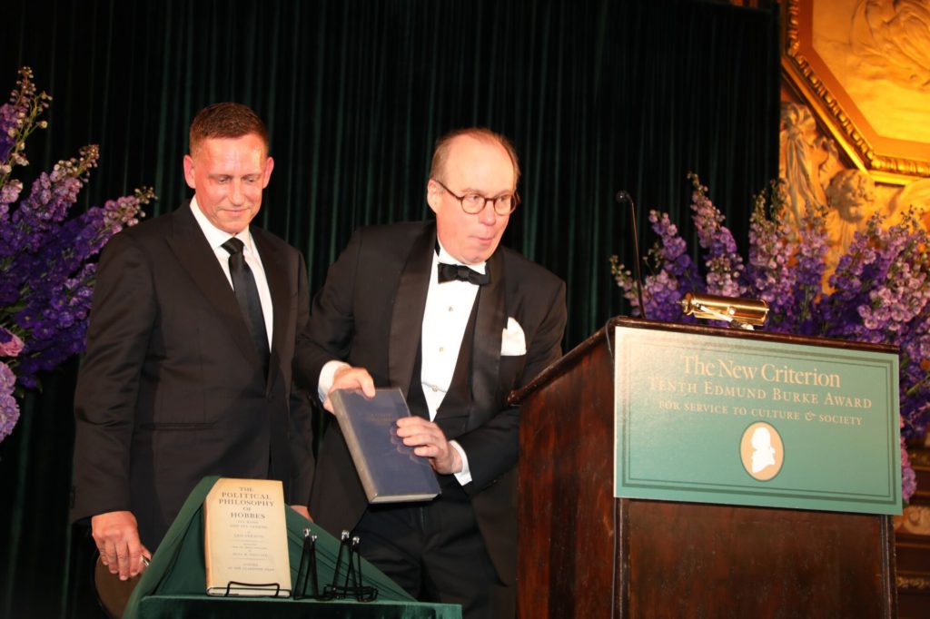 New Criterion’s editor and publisher Roger Kimball, presented Thiel with its Edmund Burke Award, citing the stipends he gives for college students to leave school and work at improving society.