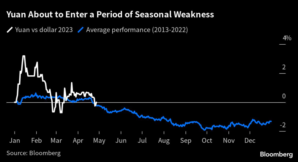(Bloomberg) — A lackluster year for the yuan looks set to take a turn for the worse if history is a guide, with seasonal dividend payouts and a traditional period for foreign vacations set to weigh.