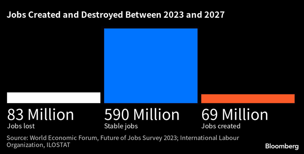 (Bloomberg) — Global labor markets are poised for a new era of turbulence as technologies like artificial intelligence accelerate the decline of clerical work, while simultaneously increasing demand for technology and cybersecurity specialists.