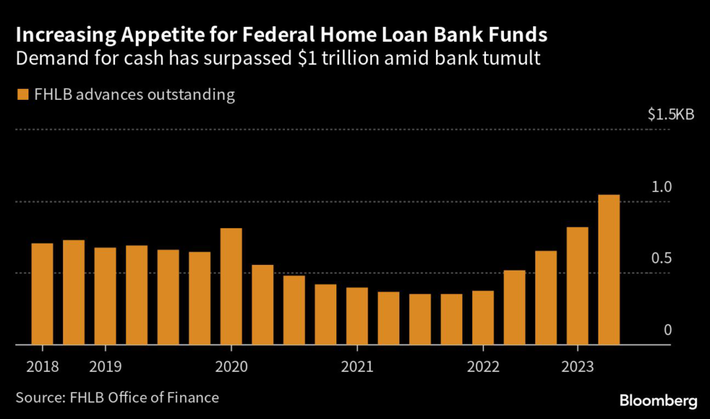 That’s up from a record $1.04 trillion reached in March’s banking crisis. The loans jumped 28% at the end of the first quarter from the end of 2022, according to the FHLB Office of Finance.
