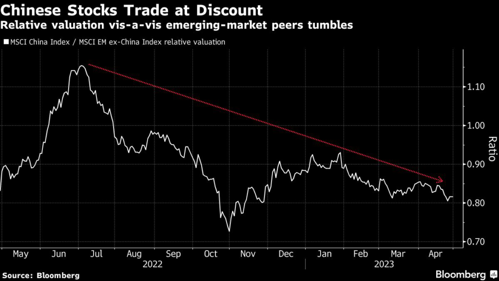 The gauge is poised to end April with a 19% valuation discount relative to the rest of emerging markets, a far cry from the 15% premium it traded at a year ago.