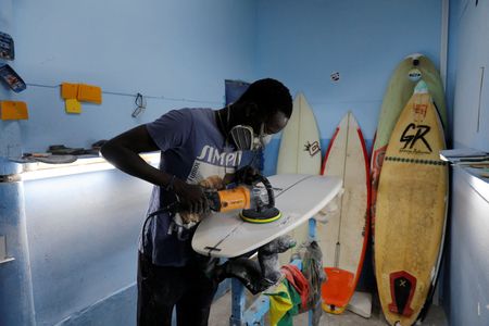 DAKAR (Reuters) – In a small beachside shack in Senegal’s capital Dakar, Pape Diouf spends hours on each surfboard he makes, shaping its foam surface with an electric planer to create the perfect curve.