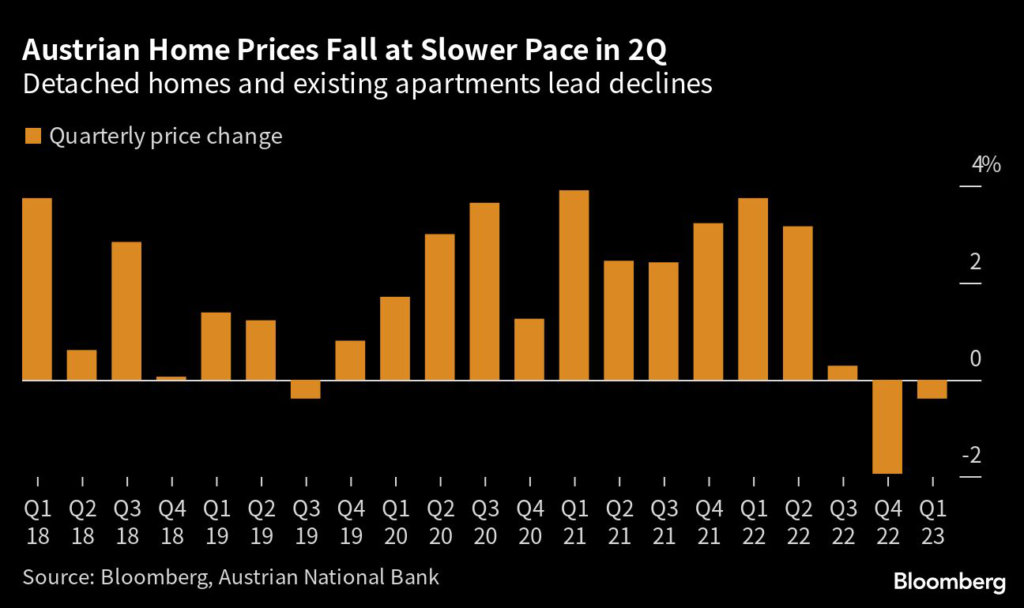The 2.3% drop in Austria’s housing market over the past two quarters compares with a 10% total decline projected for 2023 and 2024 by Raiffeisen analysts Matthias Reith and Fabian Blasch.