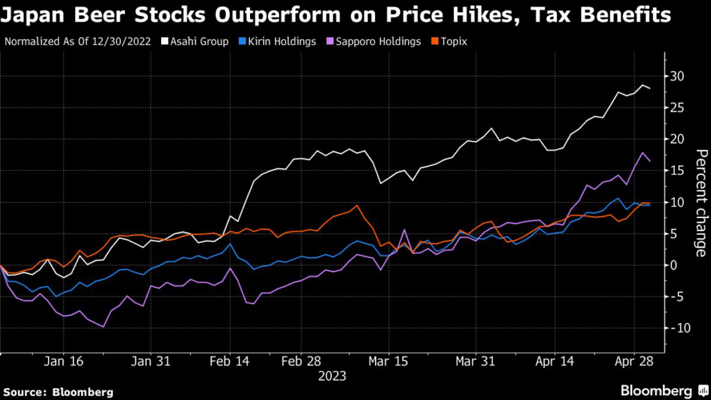(Bloomberg) — Japan’s major breweries are giving investors plenty to cheer about as their shares outperform the broader market on prospects of price hikes, more favorable taxation and a rebound in tourism.