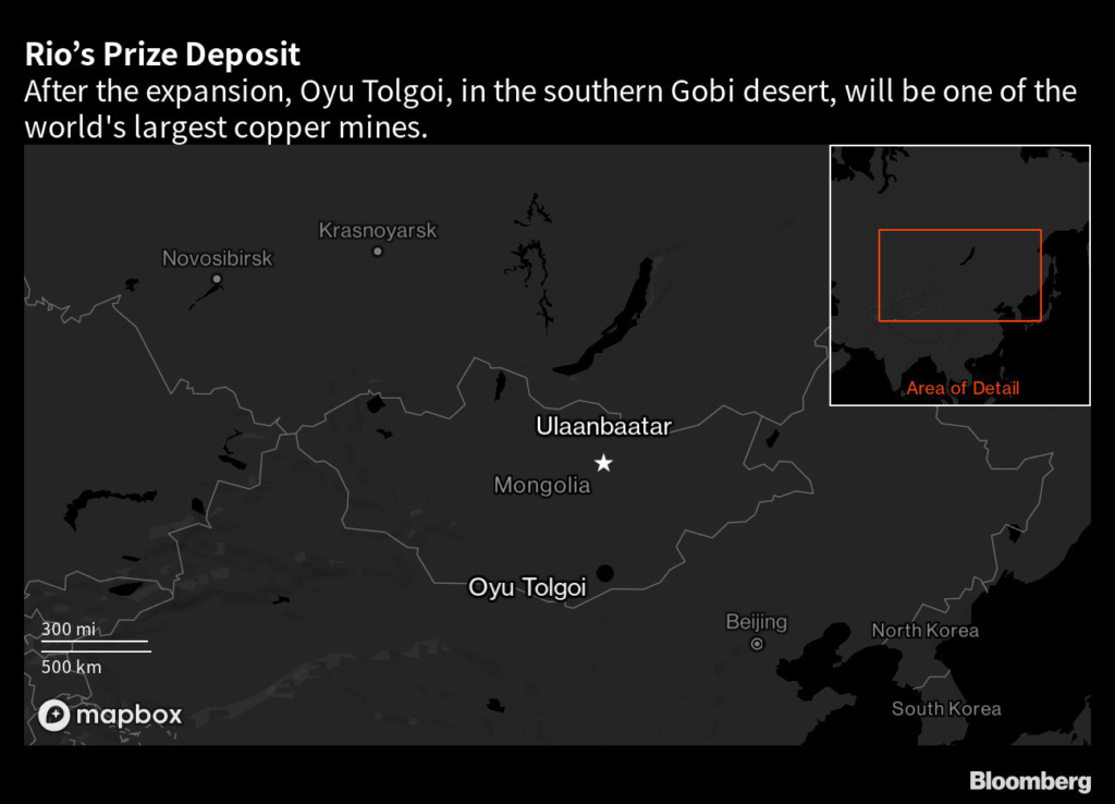 (Bloomberg) — Accompanied by tinny taped music and overall-clad workers, Rio Tinto Group executives and Mongolian officials gathered a kilometer beneath the freezing Gobi Desert earlier this year to open one of the world’s richest underground copper mines.