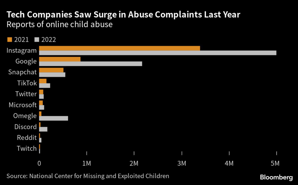 Reports of child exploitation online increased at many of the biggest tech and social media firms over the last year, including Meta Platforms Inc.’s Instagram and Alphabet Inc.’s Google.