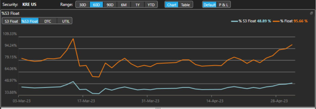 Short interest as a percentage of shares outstanding in the SPDR S&P Regional Banking ETF (ticker KRE) rose to 96% from 74% a week ago, according to data compiled by S3 Partners.