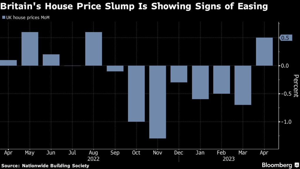 (Bloomberg) — UK house prices rose for the first time in eight months in April, halting for now the worst slump in 14 years, one of the country’s biggest mortgage lenders said.