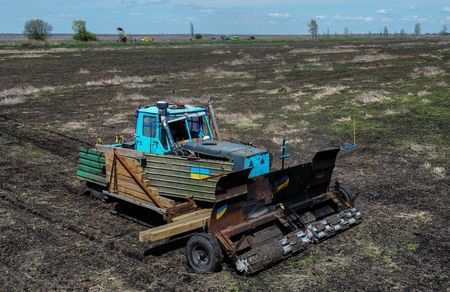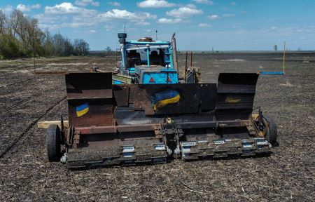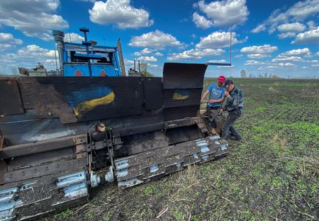 HRAKOVE, Ukraine (Reuters) – A Ukrainian farmer has come up with a novel way to remove mines left in his fields after Russia’s invasion — he’s kitted out his tractor with protective panels stripped from Russian tanks and operates it by remote control.
