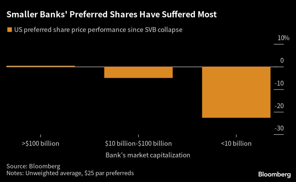 Since SVB’s demise, exchange-traded preferreds by banks with a market capitalization of under $10 billion have lost more than a fifth of their value on average, according to data compiled by Bloomberg.