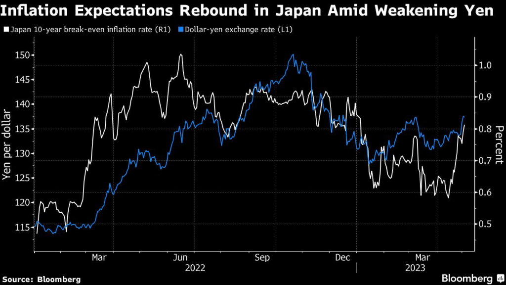 (Bloomberg) — A gauge of inflation expectations in Japan climbed to a four-month high as renewed yen weakness risks boosting import prices, keeping speculation alive that the central bank may have to reduce monetary stimulus.