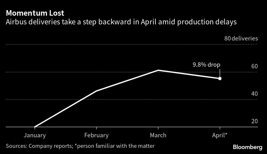 (Bloomberg) — Airbus SE delivered about 55 planes in April, according to a person familiar with the matter, as the world’s largest planemaker continues to struggle with supply shortages that have slowed production.