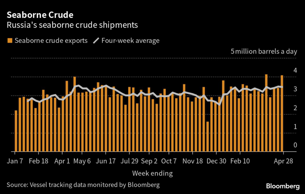 The country’s seaborne crude exports jumped back above 4 million barrels a day in the week to April 28, a level it has surpassed only once since its troops invaded Ukraine in February 2022, according to tanker-tracking data compiled by Bloomberg.