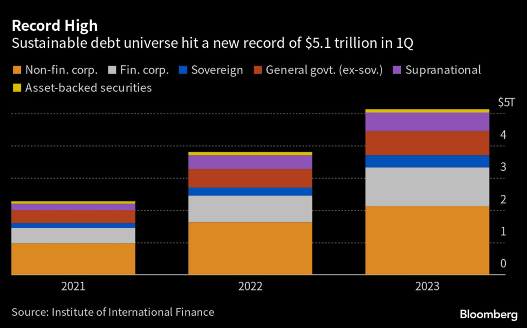 The world’s pile of socially conscious debt ballooned to a record $5.1 trillion in the first quarter — a sum the Institute of International Finance expects will keep on rising.