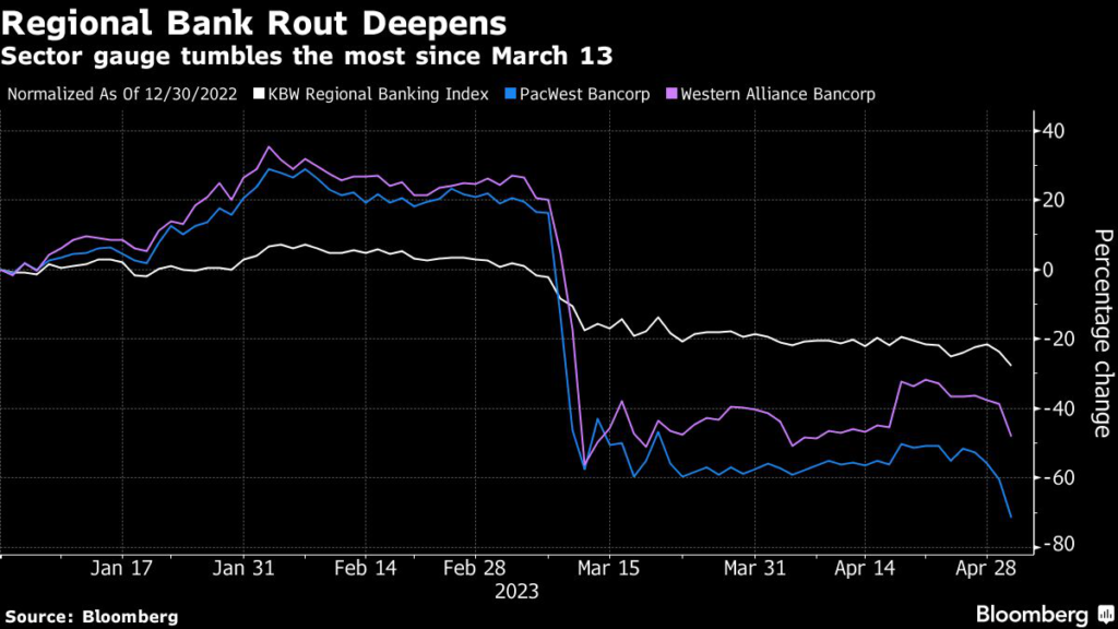 (Bloomberg) — Just a day after Wall Street breathed a sigh of relief with the rescue of First Republic Bank, a tumble in US regional lenders fueled renewed anxiety over financial stability, sinking stocks across the board and spurring a flight to the safest corners of the market.