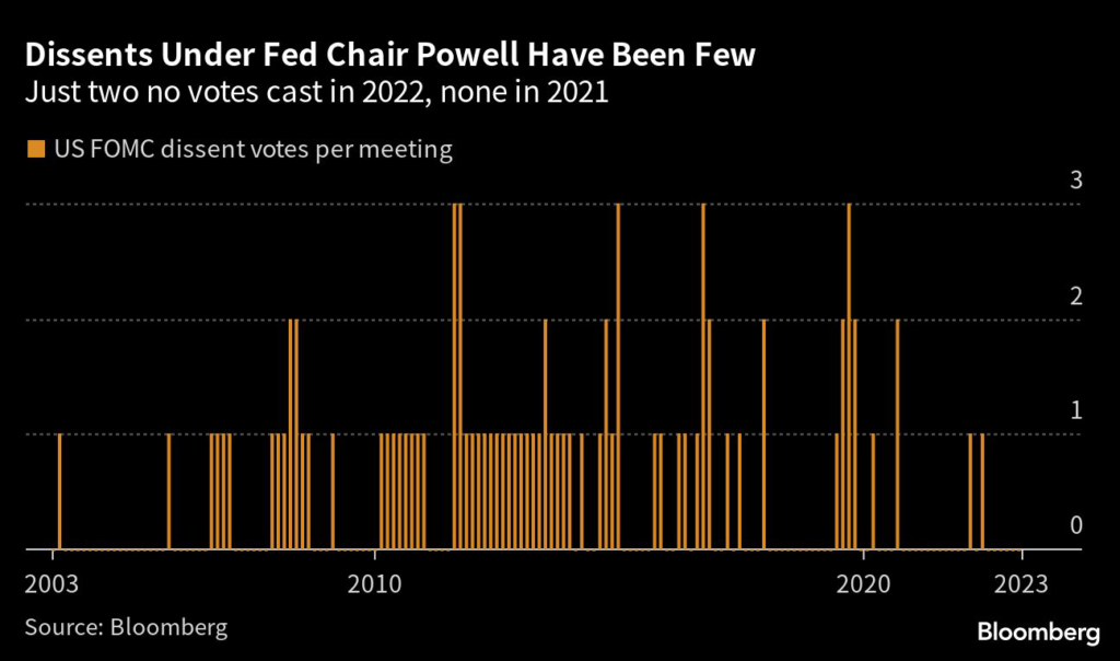 While other officials backed another a quarter-point hike this month, Goolsbee refrained from committing his support, paving the way for a potential dissent at this month’s meeting, or in the near future.