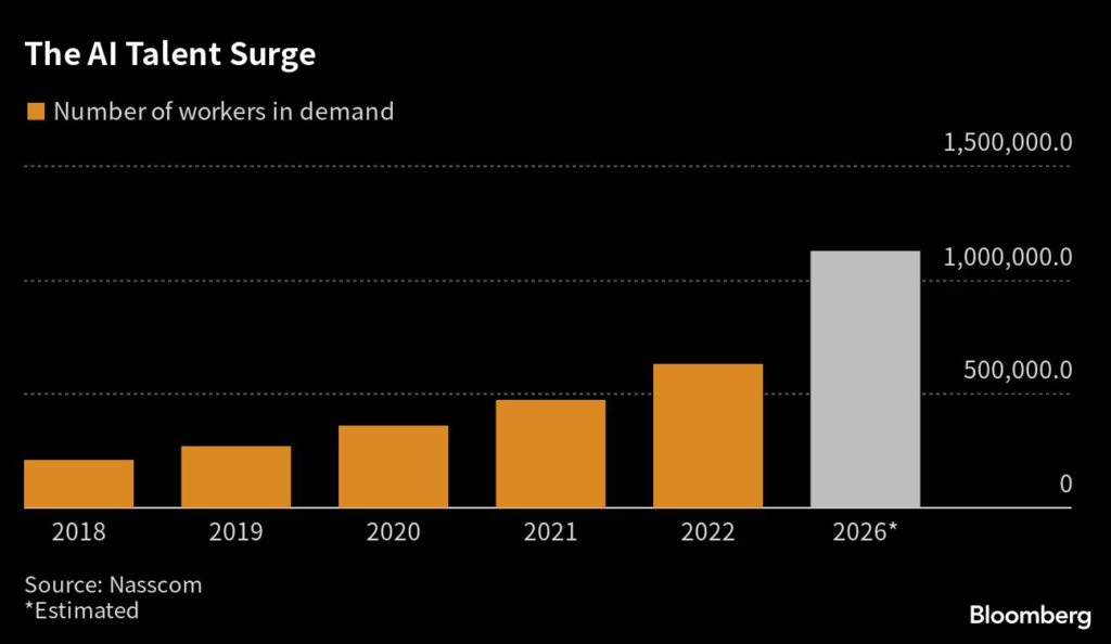 There are about 416,000 people working in AI and data science in the country —- and demand for another 213,000, according to Nasscom’s estimates. “The proportion of unfilled job roles is approximately 51% of the current installed talent base,” it said in a February report, flagging the crunch as a risk to growth.
