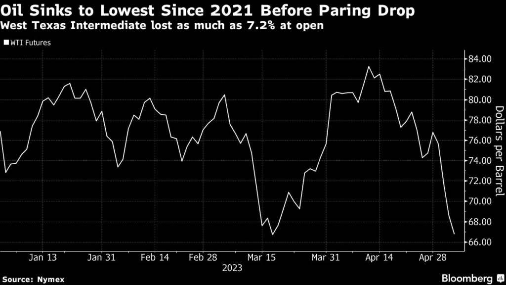 West Texas Intermediate settled below $69, extending a two-week decline, after earlier falling as much as 7.2% at the start of trading in Asia.