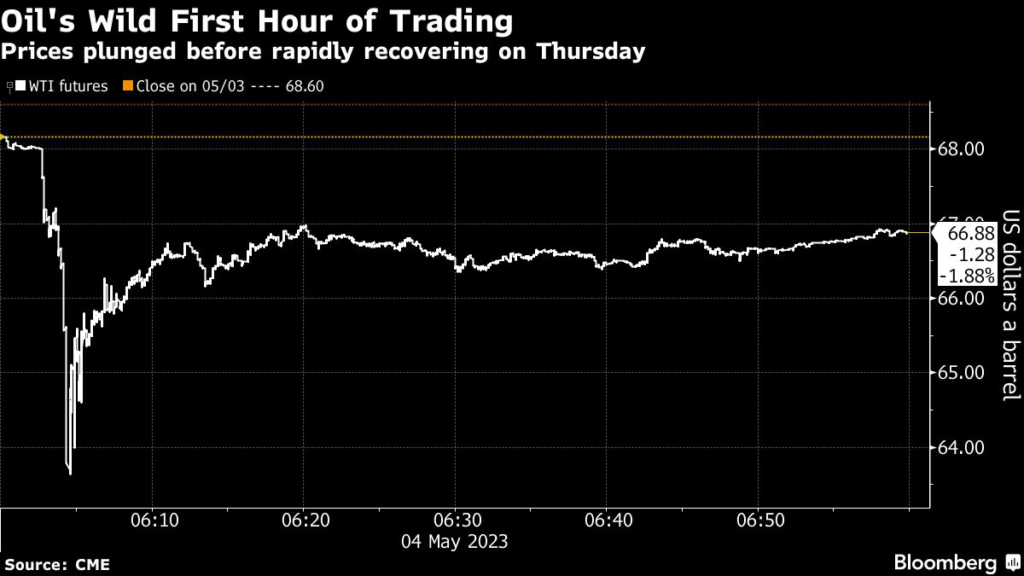 (Bloomberg) — After a wave of selling over the last week it was little surprise when US crude futures opened lower on Thursday, but few traders were braced for the 7.2% plunge that unfolded in the first dramatic minutes of trading.