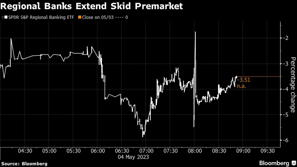 The KBW Regional Banking Index slumped, extending this year’s rout to 31%. The volatility Thursday as Western Alliance denied the Financial Times report “highlights the fragility of the market,” Bloomberg Intelligence analyst Herman Chan wrote.