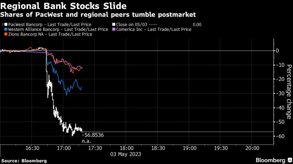 PacWest Bancorp has become the latest focal point of investor concern about the health of US regional banks, shedding nearly half its value in premarket trading, a day after Federal Reserve Chair Jerome Powell said authorities were closer to containing the turmoil that’s claimed four lenders this year.