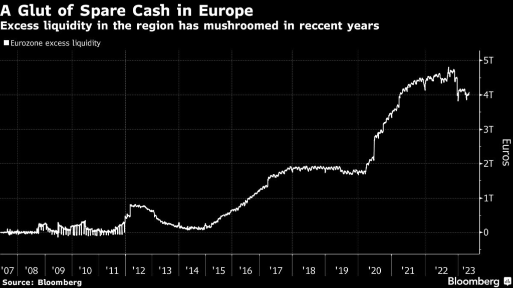 Excess liquidity in the region bulged close to €5 trillion last year, buoyed by the ECB’s bond-buying operations and loans to banks.