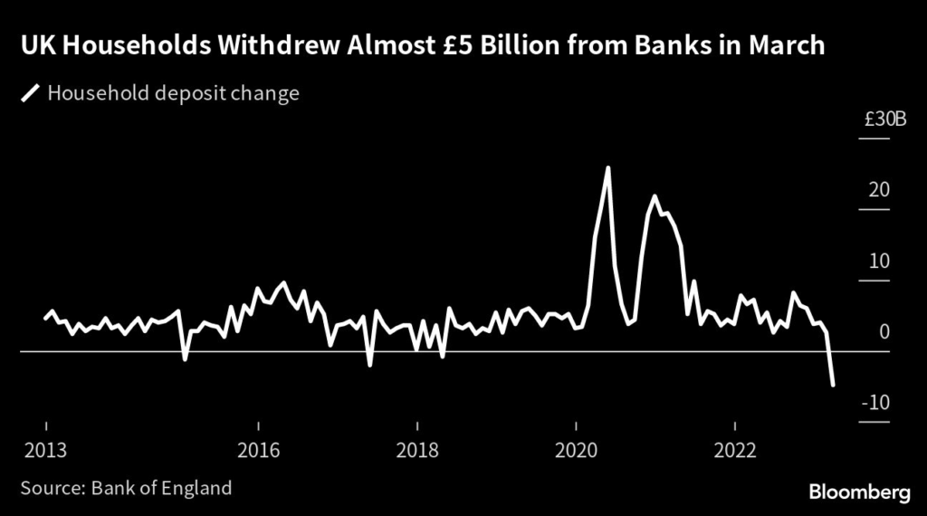 (Bloomberg) — British households and businesses pulled almost £11 billion ($13.8 billion) out from banks in March as panic spread from the collapse of Silicon Valley Bank and the takeover of Credit Suisse Group AG.