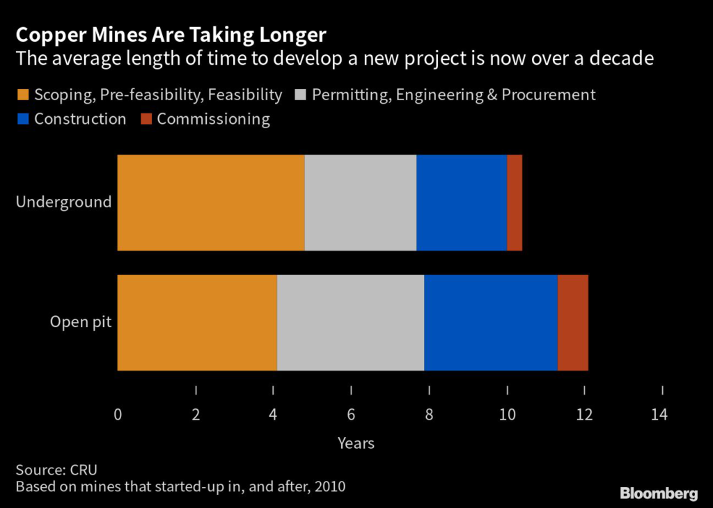 But analysts at Wood Mackenzie estimate a greener world will be short about six million tons of copper by next decade, meaning 12 new Oyu Tolgois need to come online within that period. BloombergNEF estimates appetite for refined copper will grow by 53% by 2040, but mine supply will climb only 16%.