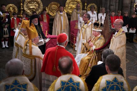 Inside Westminster Abbey, where kings and queens have been crowned since 1066, around 2,200 people were there to witness Charles’s robe of state be removed, before he was shielded and anointed with holy oil, then re-emerging as the choir sang “May the king live for ever”.