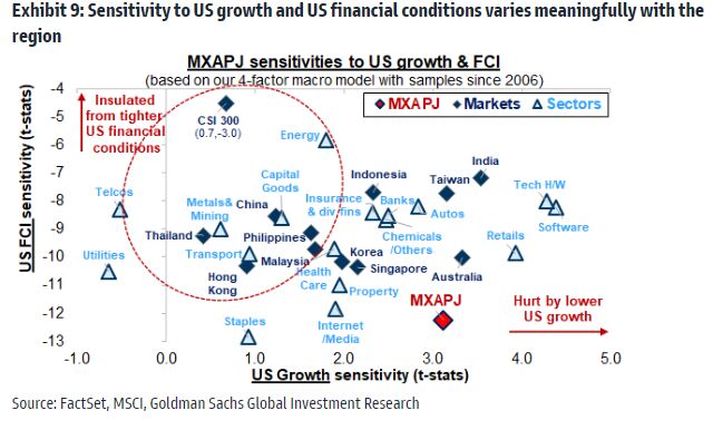 Taiwan and the information technology sector are more sensitive to US financial conditions and economic growth than most other parts of Asia Pacific excluding Japan, according to Goldman Sachs Group Inc.