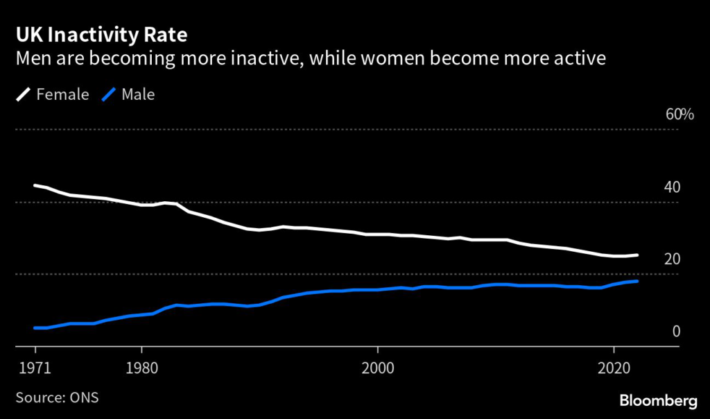 Economic inactivity levels — those out of work and not looking for a job — have climbed for men and declined for female workers.