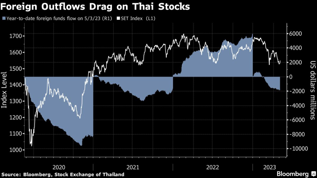The benchmark SET Index has slumped 6.4% in 2023, defying expectations that it will repeat a rally seen in the run-up to prior elections.