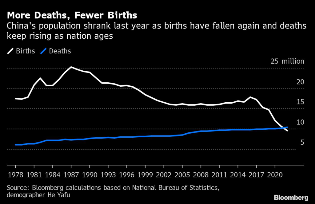 Adding to those geopolitical economic headwinds, China’s population started shrinking last year for the first time in six decades, signaling a demographic crisis. The nation’s workforce has also fallen by more than 41 million people in the past three years.