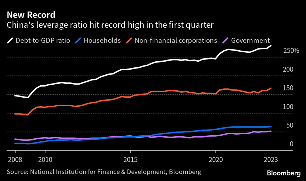 The macro leverage ratio — or total debt as a percentage of gross domestic product — soared to 279.7% in the first quarter, according to central bank and statistics bureau data compiled by Bloomberg.