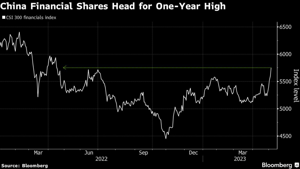 The CSI 300 Financials Index jumped for a fifth session on Monday to reach its highest level since April 2022, adding $166 billion in market value in the process.