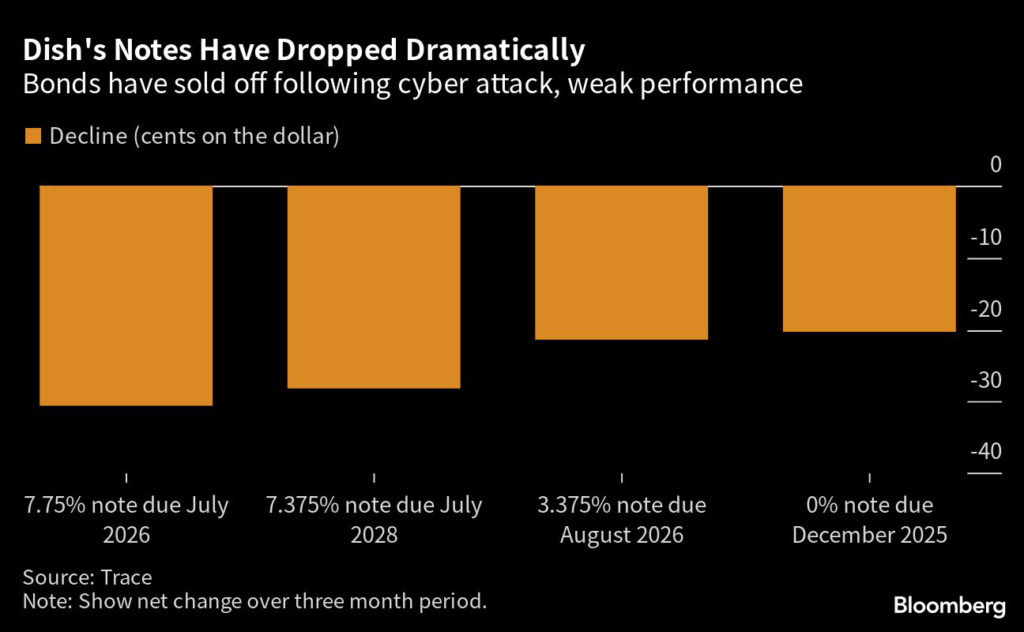 Dish’s July 2026 notes have fallen nearly 31 cents on the dollar since early February, while its 7.375% notes due July 2028 have fallen almost 28 cents over the same period.