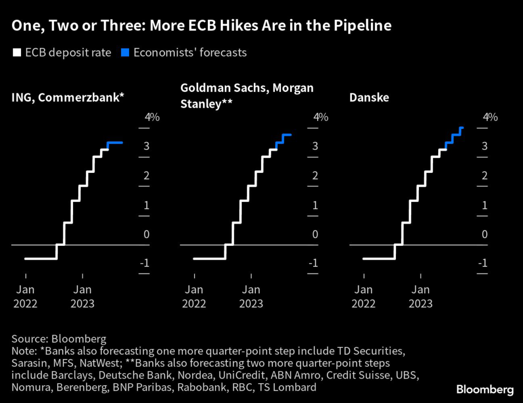 Dutch central bank chief Klaas Knot said Sunday that borrowing costs must be lifted “as long as the underlying inflation hasn’t been tamped down.” Others including France’s Francois Villeroy de Galhau have expressed similar views, while Italy’s Ignazio Visco, who’s considered more dovish, has said the ECB is close to reaching the peak in rates.