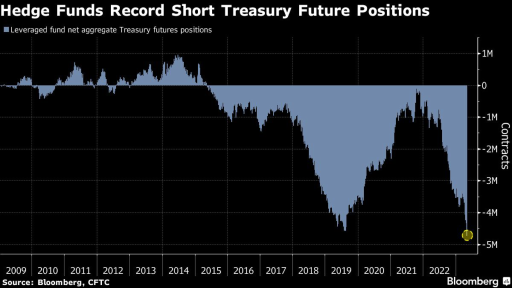 Hedge funds supercharged bearish Treasury bets to historic levels just days before the US banking turmoil took a turn for the worse and spurred a stampede for the world’s safest assets.