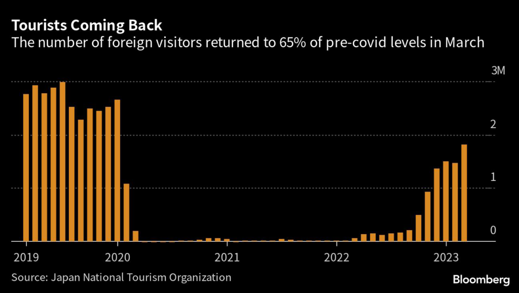 Tourism data suggest that about 1.8 million foreigners visited Japan in March, nearly 30 times more than a year earlier and around two-thirds of pre-Covid levels.