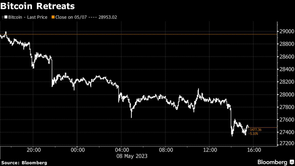 Bitcoin, which accounts for about half of the overall crypto universe with a market capitalization of around $530 billion, fell as much as 5.6% to $27,340 as of 4:53 p.m.