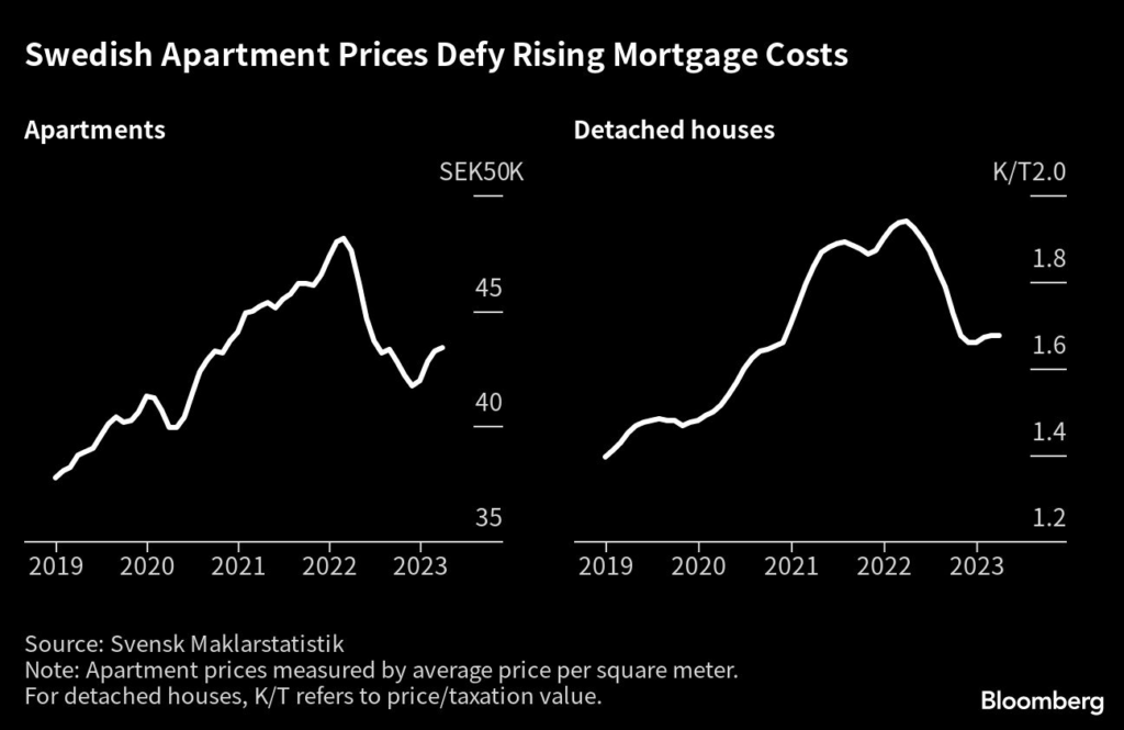 That marks a third consecutive month of stable or rising prices in both categories, following a long rout that made the Nordic country’s housing market emblematic of a global trend brought on by soaring rate of inflation and central bank tightening.
