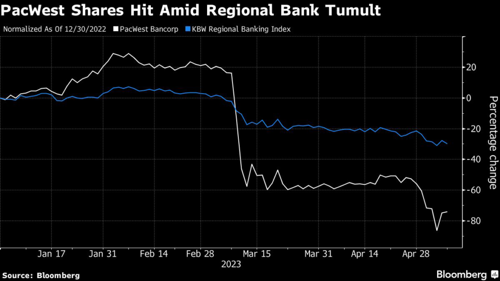 (Bloomberg) — PacWest Bancorp shifted from being the worst performer on Tuesday in the KBW Regional Banking Index to being the best, as the beaten-down bank stock swung with volatility continuing to grip the shares and the sector.
